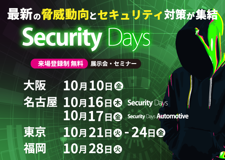 2013年より開催を続けるサイバーセキュリティ専門イベント。2025年秋開催では、4年ぶりの福岡開催に加え、名古屋会場(10月17日(金))では自動車セキュリティにフォーカスした新企画【Security Days -Automotive】を開催。